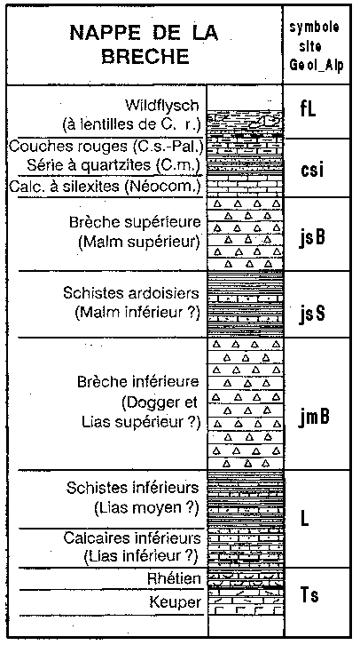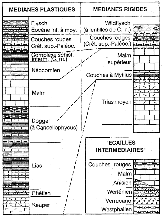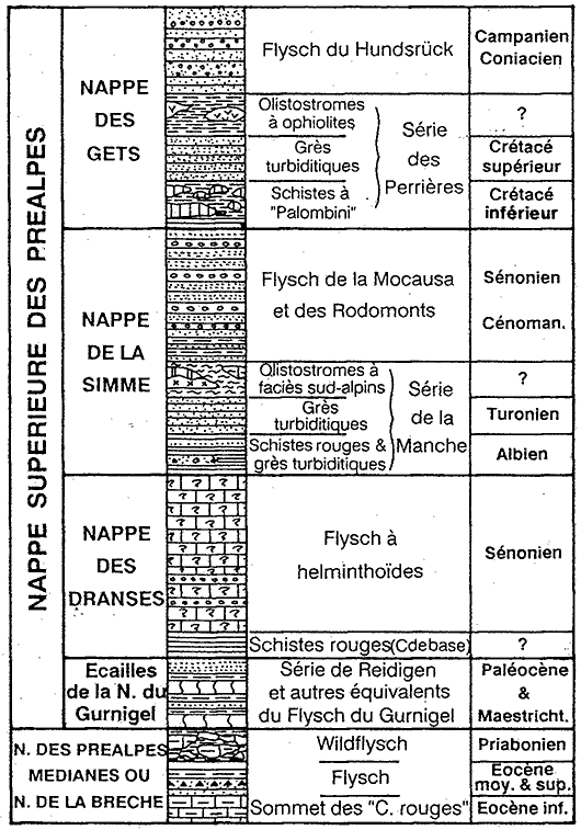 Colonnes stratigraphiques des nappes supérieures des Préalpes du Chablais d'après le guide géologique des Alpes du Nord [Masson éd.], retouché. |