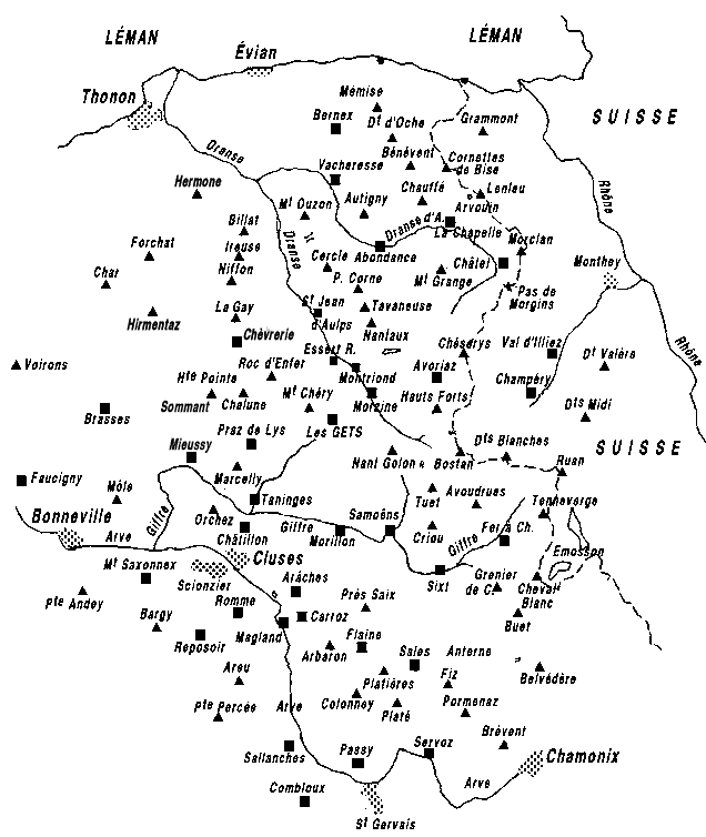Abondance Arvouin, La Chapelle Avoriaz, Morzine Bénévent Châtel Châtel-sud (Col de Bassachaux) Corbier Cornettes de Bise Dent d'Oche Grammont, Novel Hauts Forts Mémises Mont Chauffé Mont Ouzon Mont de Grange Tavaneuse Vacheresse |