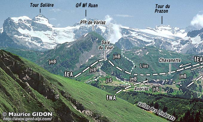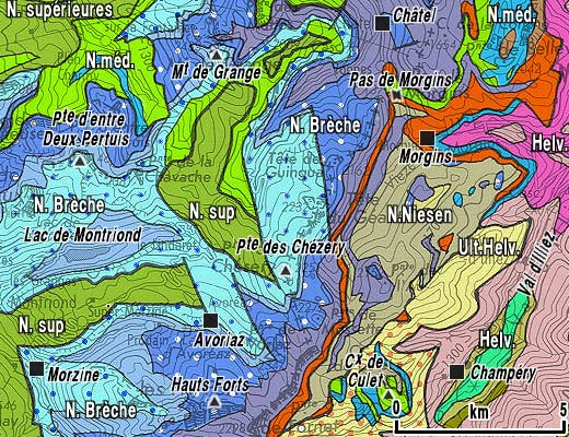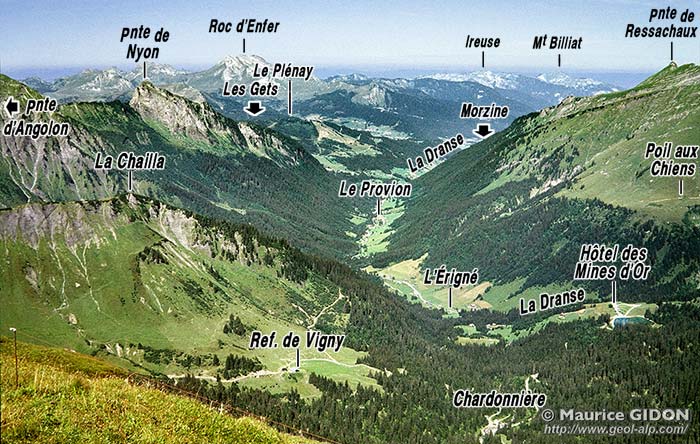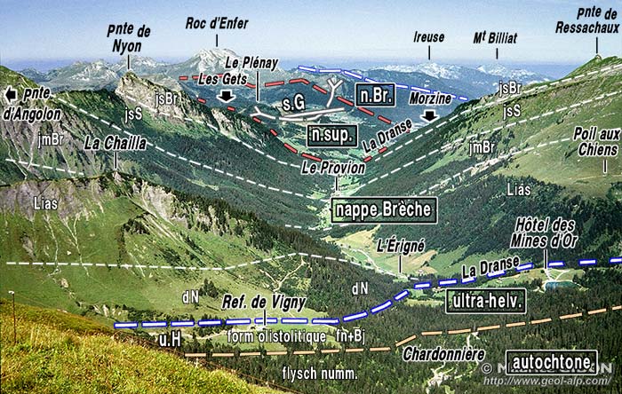 En aval de la dépression de ses sources (voir la page "Hauts Forts"), jusqu'à Morzine, la vallée de la Dranse tranche le flanc méridional du grand synclinal des Gets et donne ainsi une coupe naturelle de la succession des couches de la nappe de Brèche.