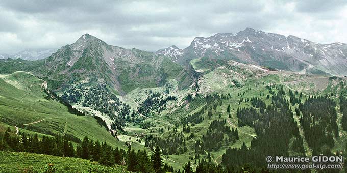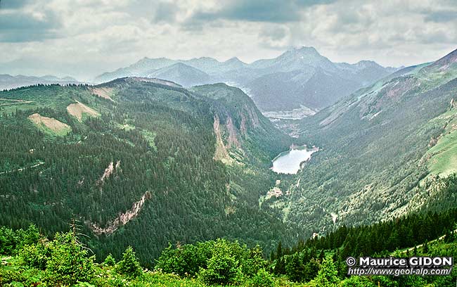 - Au nord, à la latitude de Montriond, il s'agit de l'assez large vallée à relief assez typiquement glaciaire qui héberge le Lac de Montriond : elle s'encaisse assez profondément dans l'épaisse dalle de la "brèche supérieure" parallèlement au synclinal des Gets et presque selon son axe.