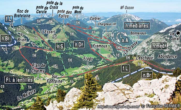 n.S = nappe de la Simme (schistes bariolés de la partie inférieure) ; n.Dr = nappe des Dranses (flysch à Helminthoïdes) ; n.Br = nappe de L Brèche ; f.L = flysch à lentilles (flysch noir incluant des olistolites, principalement de "couches rouges" du Crétacé supérieur).