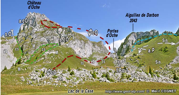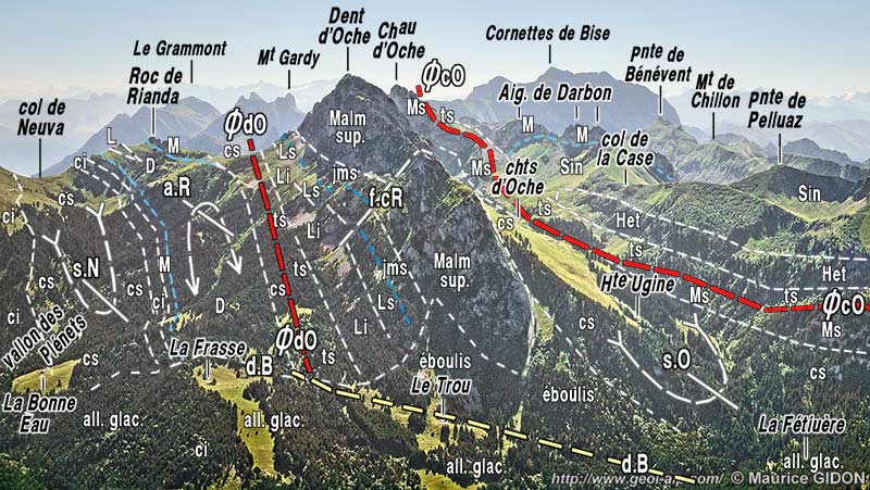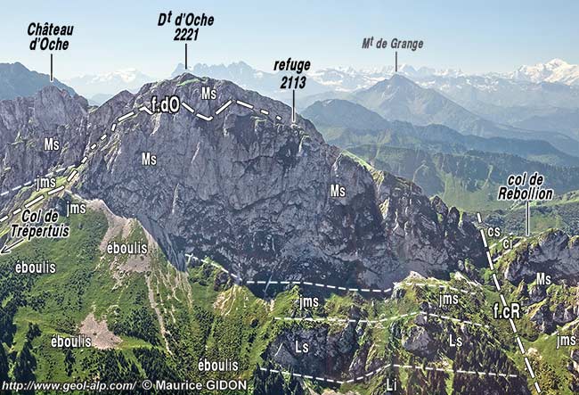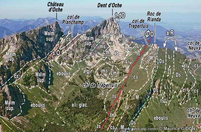 Ce sommet du Château d'Oche correspond donc, pour l'essentiel, au Malm du flanc nord de l'anticlinal immédiatement plus méridional, c'est-à-dire de celui de Pelluaz. Il est affecté en outre par un chevauchement du Château d'Oche qui y fait reposer du Trias sur le Malm. Cet accident prolonge sans ambiguité celui bien caractérisé à ce égard qui se manifeste dans les basses pentes du vallon d'Oche en faisant chevaucher la partie méridionale de l'anticlinal de Pelluaz sur le Malm redressé du flanc sud du synclinal d'Oche.