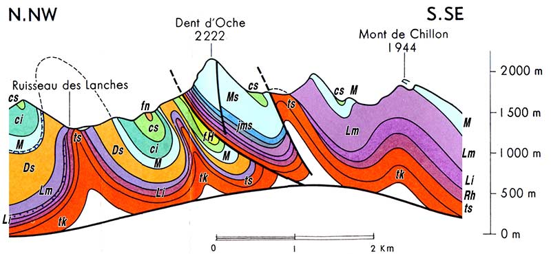 Coupe de la Dent d'Oche et des chaînons parallèles voisins (extrait retouché de la légende de la carte au 1.50.000° Thonon-Châtel)