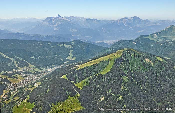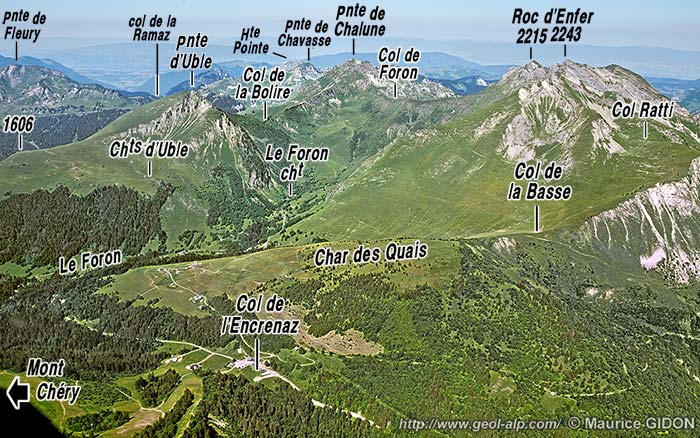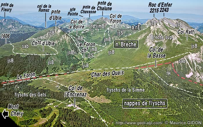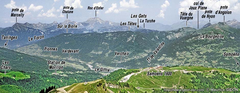 Du côté septentrional la cuvette des Gets est fermée par les reliefs, plus vigoureux et plus accidentés, qui constituent le chaînon du Roc d'Enfer. Ils appartiennent également à la nappe de la Brèche, mais ils sont disséqués par l'érosion de façon plus compliquée qu'une simple cuesta ; ceci résulte principalement de leur structure tectonique, que l'on peut assimiler à un bourrelet anticlinal (voir la page "Roc d'Enfer" et la coupe ci-dessus).