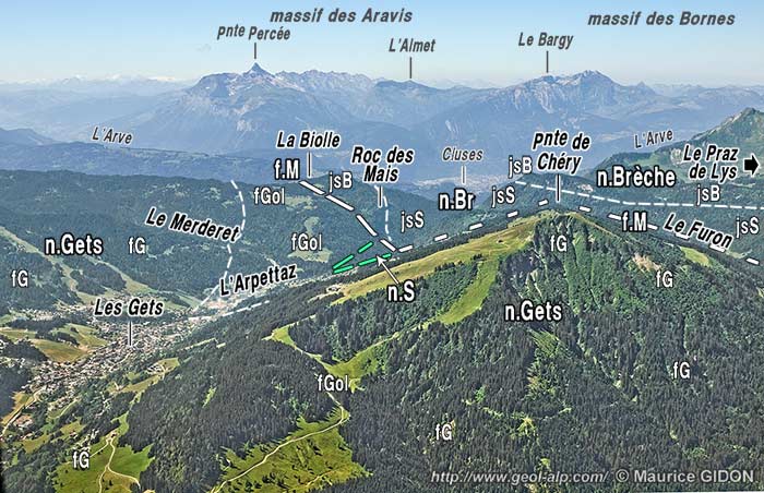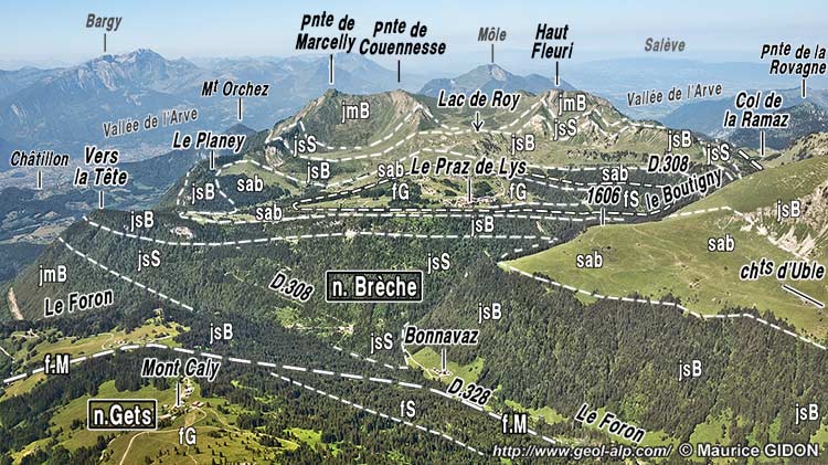En aval du Pont des Gets jusqu'à Taninges les gorges du Foron donnent une bonne coupe naturelle, non perturbée, de la succession de cette nappe de la Brèche : elles sont dominées du côté septentrional par la crête du Marcelly, qui tombe sur la vallée du Giffre, à la hauteur de Taninges, par un abrupt de plus de 1000 m (voir la page "Taninges").