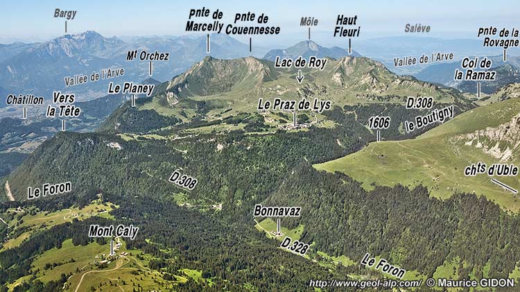 La crête de Marcelly domine du côté NE le petit domaine de la station de ski du Praz-de-Lys, qui est relativement isolé entre la vallée du Giffre et le cours supérieur du Foron en amont du coude brutal vers le NW qu'il décrit au Pont des Gets. Elle y occupe une zone d'alpages peu déclive qui s'avère être un petit val correspondant à un synclinal du Praz de Lys. D'axe NW-SE, il est bordé du côté est par un ample repli anticlinal crevé axialement par la gorge du Foron en amont du Pont des Gets. Son cœur abrite une klippe* de flysch des Gets qui repose, du côté nord, sur un coussin de flysch de la Simme. Cette cuvette n'est en fait qu'une dépendance occidentale de celle des Gets, individualisée par rapport au grand synclinal des Gets du fait de l'orthogonalité de ces replis parasites.