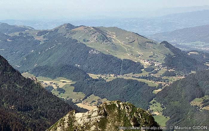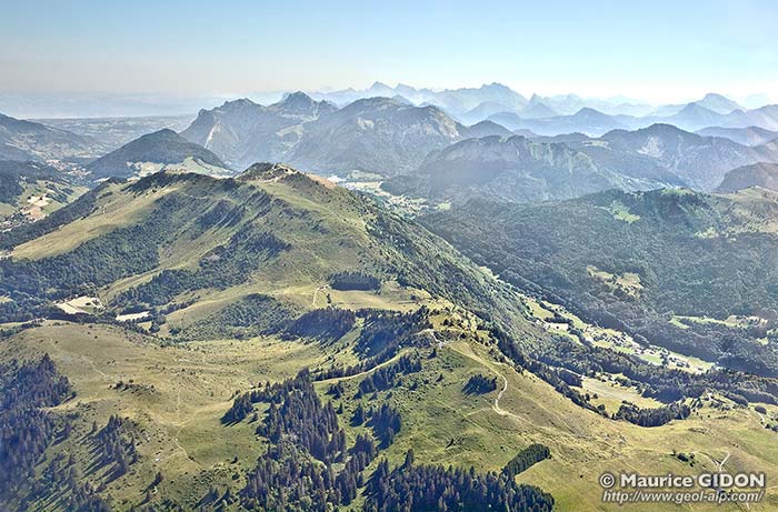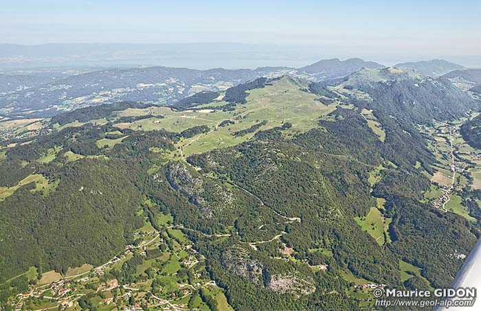![]() La montagne d'Hirmentaz, vue du sud-ouest d'avion, depuis l'aplomb de Bogève (versant est de la vallée de la Ménoge) |