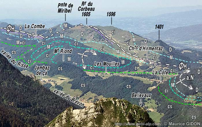 Elle constitue, sur la transversale de Habère-Lullin, le chaînon le plus occidental de ceux du domaine des "Médianes plastiques" (caractérisé par ses épaisses couches marno-calcaires du Dogger) ; il trouve son prolongement méridional (au sud-ouest d'Onnion) dans la montagne des Brasses et se poursuit structuralement vers le nord par ceux de rive gauche de la vallée de la Follaz (environs de Lullin).