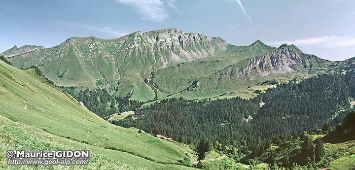 En rive gauche (sud-occidentale) de la Dranse de Morzine le chaînon des Hauts Forts trouve son prolongement structural et lithologique dans celui de La Pointe d'Angolon - Joux Plane (voir la page "Samoëns") .