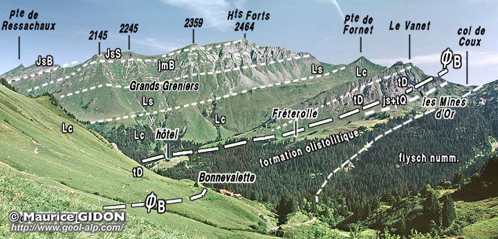 ![]() Le versant méridional des Hauts Forts, dominant les vallons des sources de la Dranse vus du sud, depuis le col de la Golèse . ØB = surface de chevauchement de la nappe de la Brèche ; js+tQ = lame tectonique des Mines d'Or (appartenant aux "écailles intermédiaires"). |