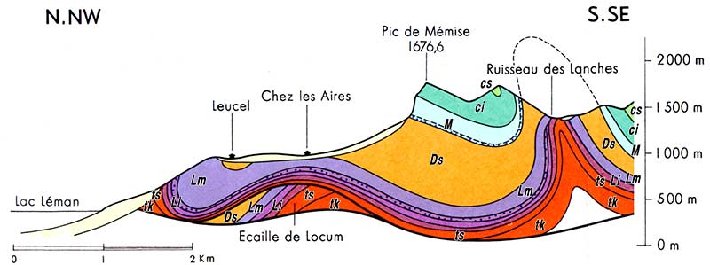 Coupe du chaînon des Mémises et de ses pentes occidentales (extrait retouché de la légende de la carte au 1.50.000° Thonon-Châtel) |