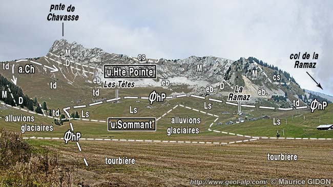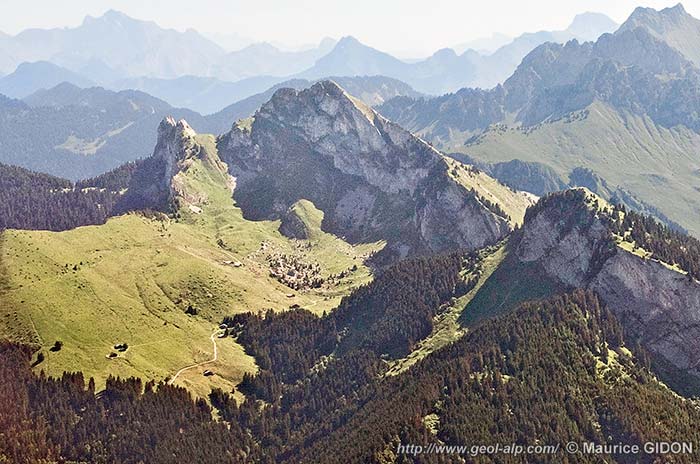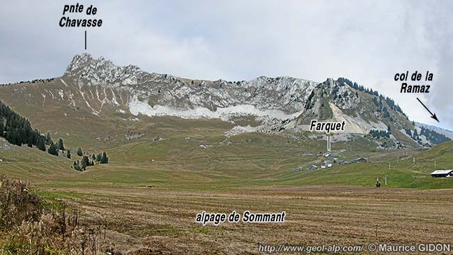 La bande d'affleurements des Médianes de Sommant est séparée des Médianes plus occidentales par une zone synclinale où affleure, de plus en plus largement au nord de Mieussy, le flysch à Helminthoïdes de la nappe des Dranses. Cette bande se rétrécit en outre vers le nord jusqu'en rive droite de la vallée du Brévon (voir la page "Chèvrerie") et se termine sur la crête de partage des eaux avec la Dranse de Morzine : elle dessine donc une demi-fenêtre tectonique qui s'ouvre vers le sud. Cela traduit le fait qu'elle a grossièrement la structure d'un anticlinal dont l'axe s'enfonce sous la nappe des Dranses, au delà de cette crête, au col des Follys (voir la page "Roc d'Enfer").