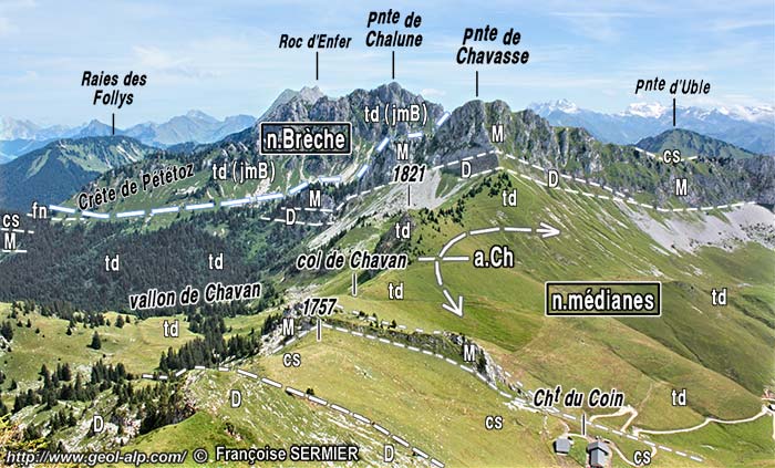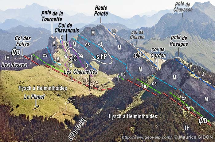 Sur la transversale du col de Chavan les deux flancs de cet anticlinal de Chavan sont assez clairement représentés par les crêtes, presque symétriques et de constitution stratigraphique assez similaire, de la Pointe de Chavasse et de la Haute Pointe, la première appartenant au flanc oriental, normal, et la seconde au flanc occidental, renversé.