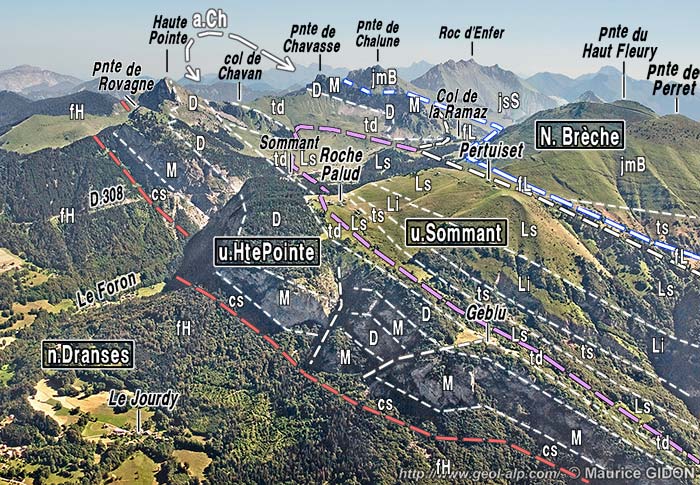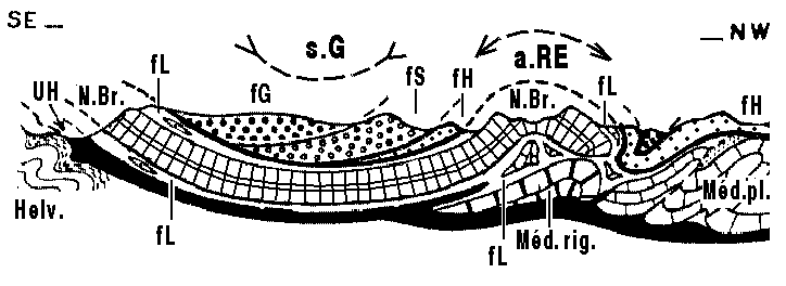 ![]() Coupe schématique du Chablais sud - oriental (les clichés ci-dessus et ci-dessous ne montrent que la partie droite de cette coupe) a.RE = anticlinal du Roc d'Enfer (pli "frontal" de la nappe de la Brèche) ; s.G = synclinal des Gets. fG = Flysch des Gets (à olistolites de croûte océanique) ; fS = Flysch de la nappe de la Simme proprement dite ; fH = Flysch à Helminthoïdes (nappe des Dranses) ; fL = "flysch à lentilles" et olistostrome frontal de la nappe de la Brèche (consulter la légende générale pour les autres abréviations) . |