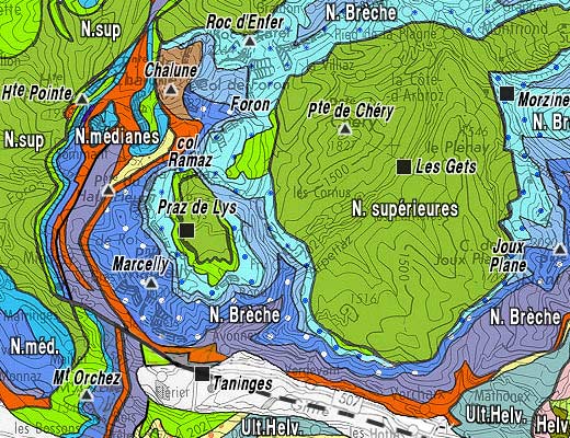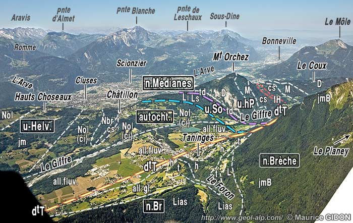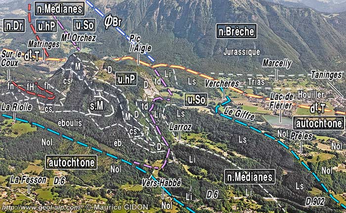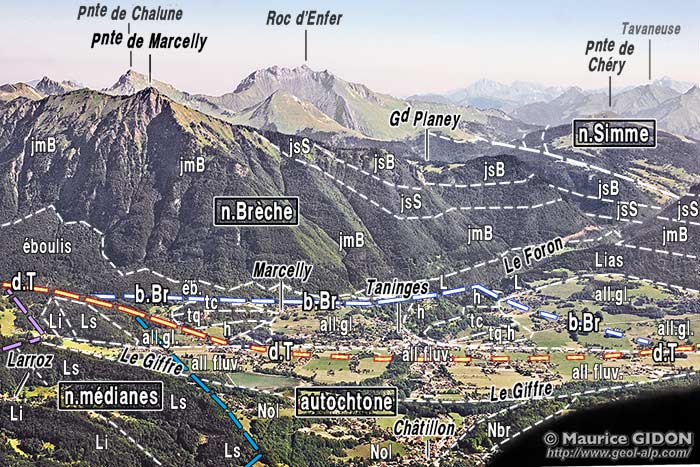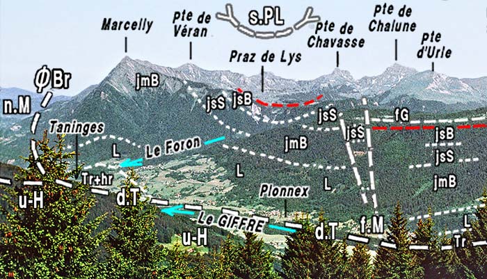 Le rejet horizontal de ce décrochement de Taninges se manifeste notamment par l'interruption, au pied de l'abrupt, des deux unités imbriquées, appartenant aux nappes médianes, que le Giffre traverse sur la transversale de la Pointe de Marcelly (voir le cliché en fin de page) : au nord de la cassure on retrouve leur prolongement, décalé d'environ 2 km vers l'ouest (c'est-à-dire dans le sens sénestre), dans les pentes dominant Matringes (voir la page "Mieussy"). La carte géologique au 1/50.000°, feuille "Samoëns", n'en fait curieusement pas état ... |