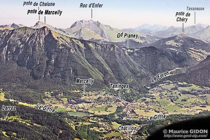 À l'aplomb même de Taninges ce rebord d'érosion est constitué par le versant méridional de la crête de la Pointe de Marcelly, qui tombe sur la vallée par un abrupt de plus de 1000 m d'un seul jet. Ce dernier, qui marque l'extrême limite méridionale des affleurements du matériel de cette nappe, semble être essentiellement d'origine tectonique : il apparaît en effet comme dû au sectionnement de la tranche des couches de la nappe de la Brèche par une grande cassure sub-verticale sénestre orientée NW-SE, le décrochement de Taninges, dont le tracé est évident au pied ouest du sommet de la montagne.