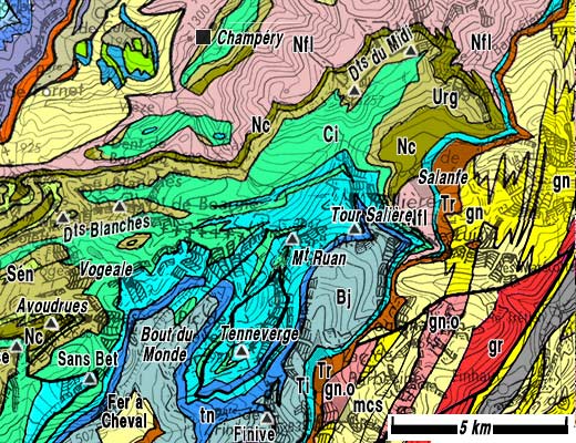 Or plus au sud encore, l'érosion qui a ouvert le cirque du Fer à Cheval ne les fait pas réapparaître (ce qui n'est pas étonnant puisqu'elle est moins profonde encore, du fait de ce plongement axial). Au contraire elle a mis à nu sous la série de couches bajociennes du flanc SE de l'anticlinorium du Ruan des affleurements de Trias qui constituent la "boutonnière des Pellys", supposée faire réapparaître le soubassement autochtone de la nappe de Morcles. De fait on observe là une coupe identique à celle de la couverture sédimentaire du massif cristallin des Aiguilles Rouges, longuement visible sur le versant oriental de la crête frontière : le Lias-Dogger y repose, le plus souvent à l'endroit aussi, selon toutes apparences (voir la page "Barberine"), sur le Trias également à l'endroit. Cela se fait par l'intermédiaire d'une lame de quelques dizaines de mètres d'épaisseur de calcaires clairs attribués au Jurassique supérieur, dont un lambeau semble exister à l'est des Pellys mais qui ne se poursuit pas au delà vers le sud-ouest (on n'observe pas ces calcaires non plus à la latitude du Buet, dans la boutonnière des Fonds où affleure également le Trias) En outre, que ce soit au Fer à Cheval ou de l'autre côté de la crête frontière, il n'y a aucun indice ni stratigraphique ni tectonique de la présence d'un flanc inverse étiré. En fait les calcaires attribués au Jurassique supérieur semblent reposer par un simple contact stratigraphique sur les couches triasiques, lesquelles sont elles-mêmes remarquablement dénuées d'indice d'étirement (succession à l'endroit se terminant par des bancs réguliers de dolomie). voir à ce sujet la coupe d'ensemble en page "massif de Sixt"et la page "nappe de Morcles". |