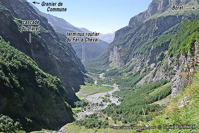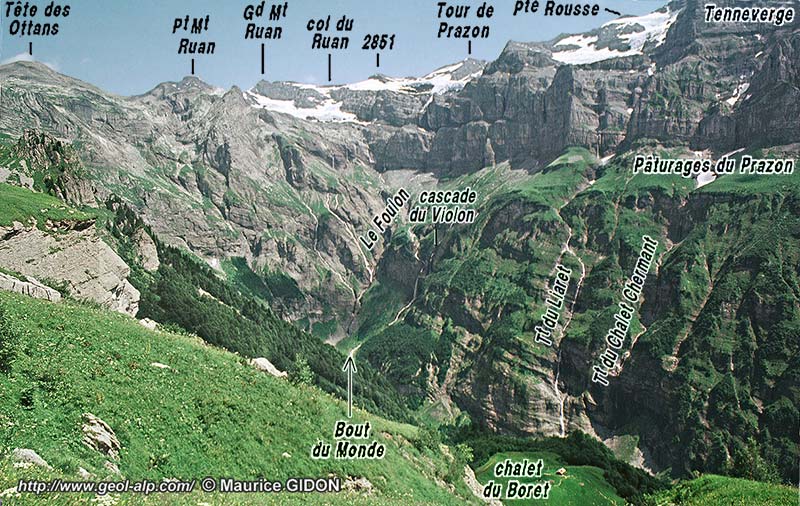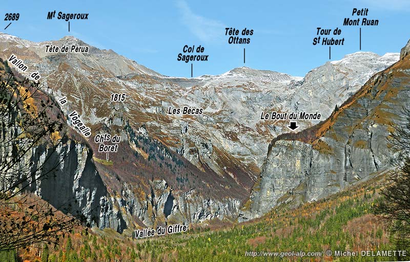 La vallée des sources du Giffre, allongée SW-NE, se termine en un cul de sac nommé le Bout du Monde entre le chaînon du Mont Ruan à l'est et les pentes du Mont Sageroux à l'ouest (voir la page "Vogealle"). Son entaille, se caractérise notamment par son encaissement entre des versants boisés très escarpés. Ceux-ci sont typiques d'une vallée anciennement occupée par une langue glaciaire ; mais en fait leur épaulement supérieur de rive gauche prolonge vers l'amont celui de la partie septentrionale du cirque du Fer-à-cheval, qui à une origine structurale puisqu'il correspond à la limite entre les calcaires argileux du Jurassique moyen et les marnes (Terres Noires) de la base du Jurassique supérieur.