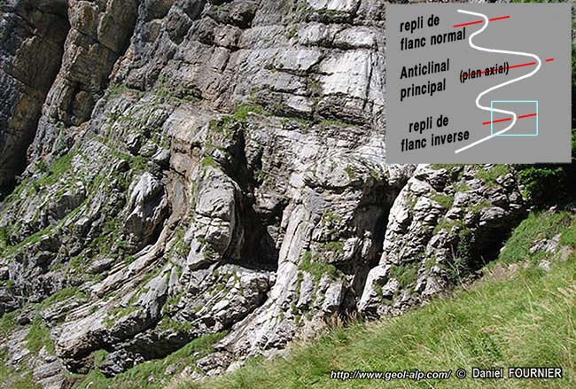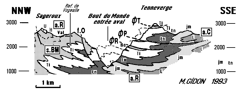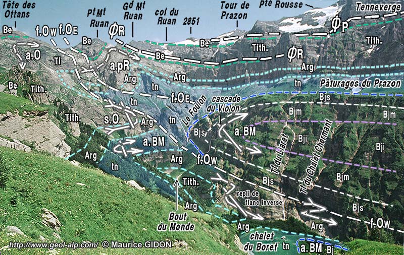 On peut constater en outre, grâce à la forte dénivelée de cette entaille de la vallée des sources du Giffre, qu'il y a passage dysharmonique depuis les plis couchés, qui affectent la partie inférieure de la succession stratigraphique en fond de vallée), jusqu'aux chevauchements plats qui se développent à partir du niveau de la barre tithonique (voir les clichés ci-après). Ce changement de style est dû à la fois à la différence de nature des roches (gros bancs calcaires du Tithonique, peu propices au plissement de courte longueur d'onde) et au passage à un "niveau tectonique"* inférieur auquel l'accroissement de pression et de température favorise un plissement par "glissement-aplatissement", spécialement pour les couches plus riches en marnes du Dogger.