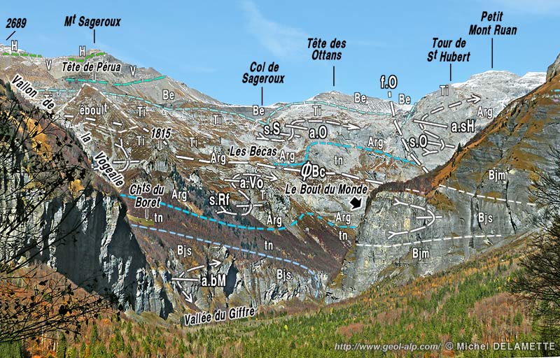 Mais ces plis du Tithonique ne font qu'affecter le flanc normal de l'anticlinorium de la nappe de Morcles dont l'anticlinal du Petit Mont Ruan est le pli axial. Au niveau du Tithonique la charnière de ce pli, bien dessinée sur le versant suisse de la crête frontière n'affleure pas sur le versant français, ceci en raison du plongement axial ces structures vers le SW. Compte tenu de son orientation son tracé doit sans doute passer sensiblement à l'aplomb du Lac de La Vogealle, pour se prolonger sous la combe de la montagne d'Oddaz, où elle doit correspondre au cœur de l'anticlinal du Tuet, qu'y dessinent les couches du Crétacé (voir la page "Dents Blanches"). Or on constate que guère plus au sud-est l'entaille du Fer à Cheval traverse tout le Jurassique et atteint le socle cristallin sans montrer de trace convaincante d'un flanc inverse : c'est donc en se déplaçant vers le SW qu'intervient ce changement majeur par rapport à la structure observable en Suisse sur la transversale des Dents du Midi et de la Tour Sallière (voir la page "Tour Sallière"). |