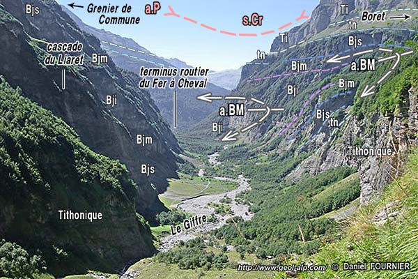 À la faveur de la montée vers le NE des axes des structures cette vallée troue encore plus profondément qu'au Fer à Cheval la carapace des terrains crétacés et du Jurassique supérieur : elle tranche donc les plis serrés qui affectent le Crétacé inférieur et surtout le Jurassique supérieur, mais avec une obliquité faible, de l'ordre de 30° (elle ne leur est pas du tout orthogonale !).