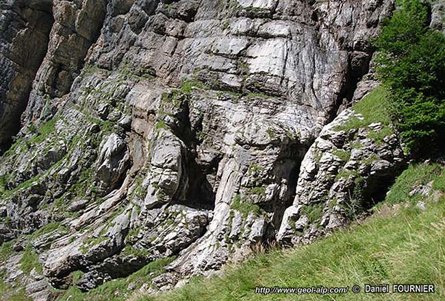 Par contre les Terres Noires, qui forment en rive droite la vire menant aux chalets du Boret, sont absentes en rive gauche, entre l'Argovien et le Bajocien. Cette suppression locale semble s'expliquer par le fait que c'est là qu'aboutit le prolongement sud-ouest de la faille occidentale des Ottans ; cette cassure, bien visible au niveau du Tithonique des crêtes (voir la page "Mont Ruan") est une faille extensive qui a joué avant le plissement et qui a dû être tordue et renversée lors de celui-ci. |