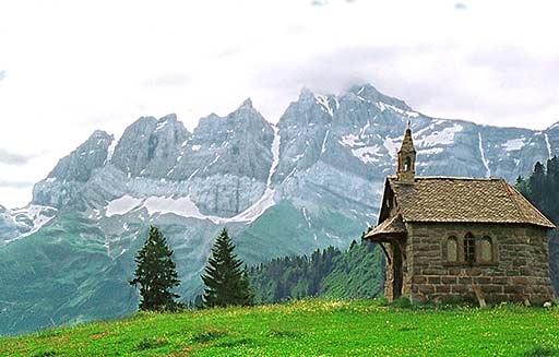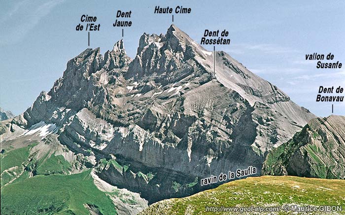 ![]() La face nord des Dents du Midi, vue de la frontière franco-suisse peu au sud-est de Châtel La succession est globalement à l'envers avec la barre urgonienne surmontant le talus nummulitique et les crêtes sculptées dans l'Hauterivien . |