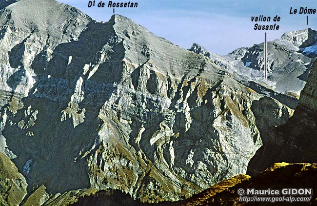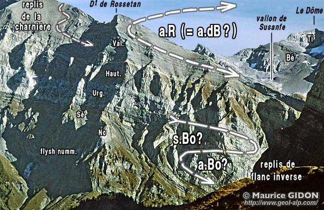 ![]() Détail des abrupts de la partie basse de l'arête ouest des Dents du Midi, vu de l'ouest, depuis les abords du col de Cous. a.R = anticlinal de Rossétan (anticlinal des Dents Blanches ?). On distingue en outre les replis secondaires de la charnière et du flanc inverse de l'anticlinal de Rossétan : s.Bo? = prolongement du synclinal de Bostan (?) ; a.Bo? = prolongement de l'anticlinal de Bostan (?). On note que ces replis sont disposés avec des rapports flanc court / flancs longs tout-à-fait conformes au schéma des "replis en feuille de chêne" concernant un flanc inverse d'anticlinorium. |