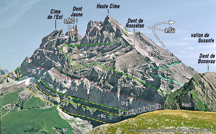 Le pli inférieur, ou anticlinal de Rossétan, a une charnière décapée de son Urgonien mais un cœur où affleurent largement les couches plus récentes que l'Hauterivien. Le pli supérieur, ou synclinal de la Haute Cime ne conserve lui-même de l'Urgonien de son cœur que deux panneaux rocheux isolés Le flanc inverse du premier montre en outre un beau repli parasite dont les rapports flancs longs - flanc court sont sont très typiques de ceux créés dans le flanc inverse d'un anticlinorium* (voir l'article correspondant), particulièrement si le mode de plissement qui est à leur origine consiste en glissement-aplatissement.