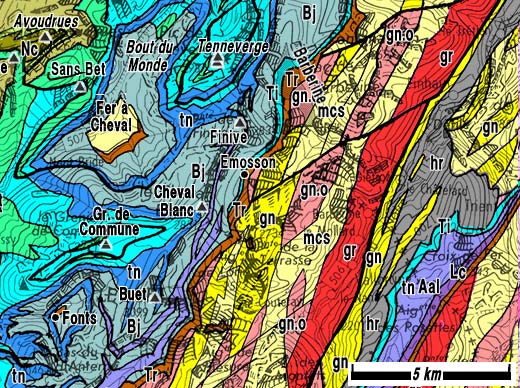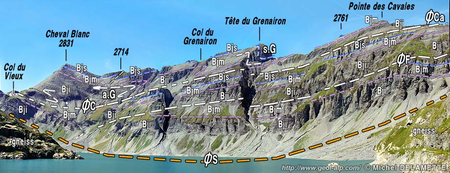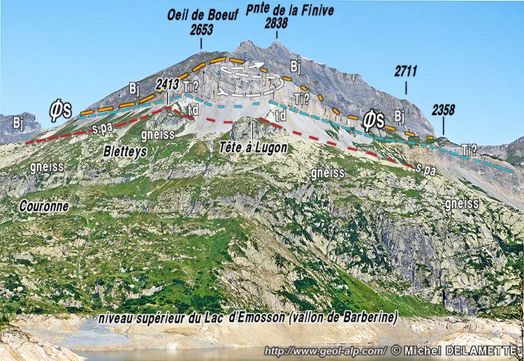 Mais il s'avère (observations inédites faites en 2023, par M. Delamette) que, dans les pentes des Bletteys, la surface de friction, qui est bien caractérisée, se situe au dessus des dolomies blanches triasiques autochtones. Elle leur superpose une succession débutant par des calcaires clairs, présumés d'âge jurassique supérieur et se complétant vers le haut, en apparente continuité stratigraphique, par des marnes (attribuées à l'Oxfordien) qui passent aux calcaires argileux noirs du Bajocien des pentes supérieures de l'Œil de Bœuf. |