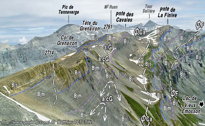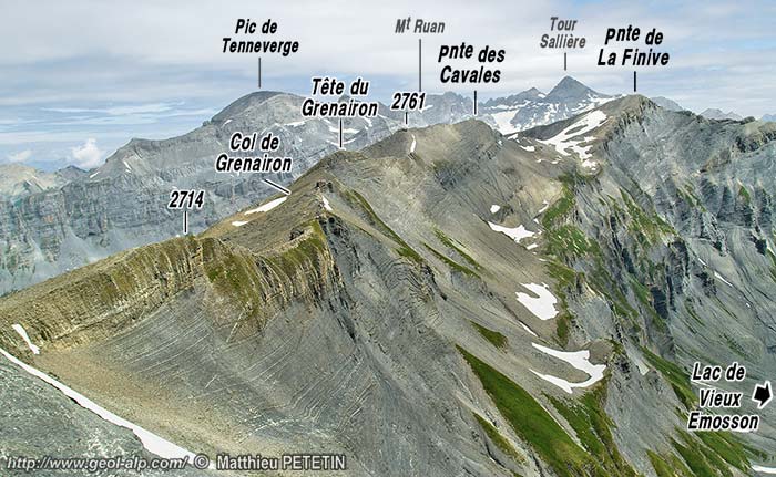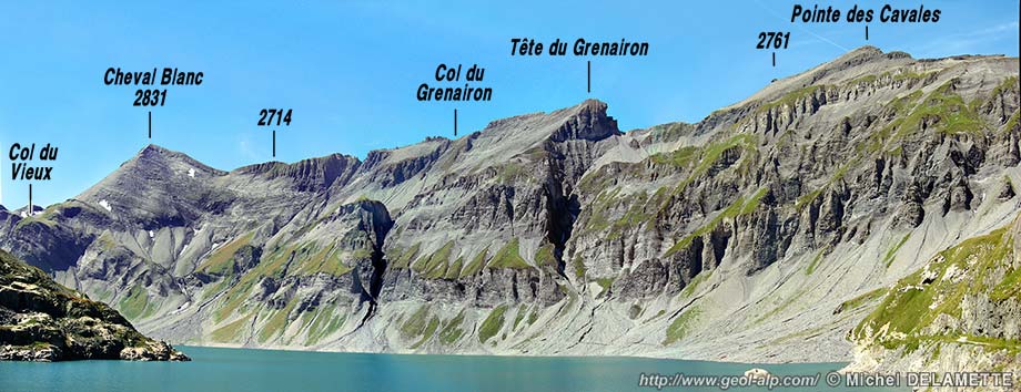 La rive ouest du lac de Vieux Emosson est, à l'opposé de celle orientale, entièrement dominée par des escarpements : ce sont ceux de la crête Buet - Tenneverge, plus précisément de sa partie frontalière comprise entre Le Cheval Blanc et la Pointe de la Finive. Cette crête est exclusivement constituée par les couches inférieures, bajociennes, de la succession subalpine charriée (prolongement de la nappe de Morcles vers le sud). Mais cette tranche de strates y est sur-épaissie tectoniquement, par le jeu de deux chevauchements, le chevauchement de la Finive et le chevauchement des Cavales, à la faveur desquels elle est répétée trois fois. En outre la tranche supérieure se montre reployée par un couple de plis déversés vers l'ouest (anticlinal et synclinal du Grenairon), ce qui accroît encore son épaisseur.