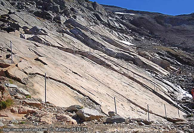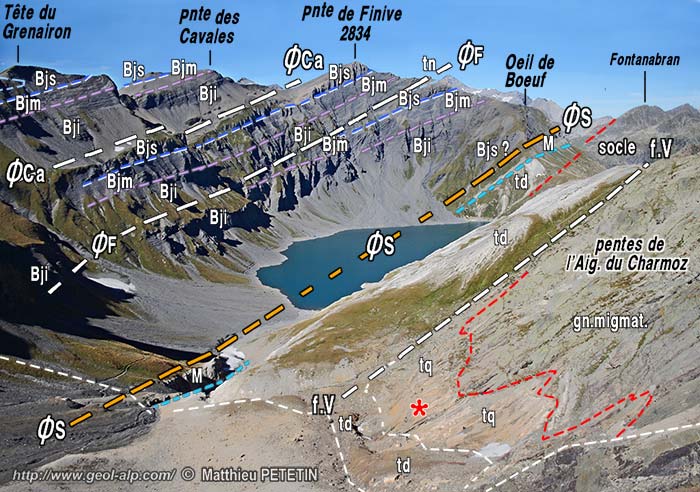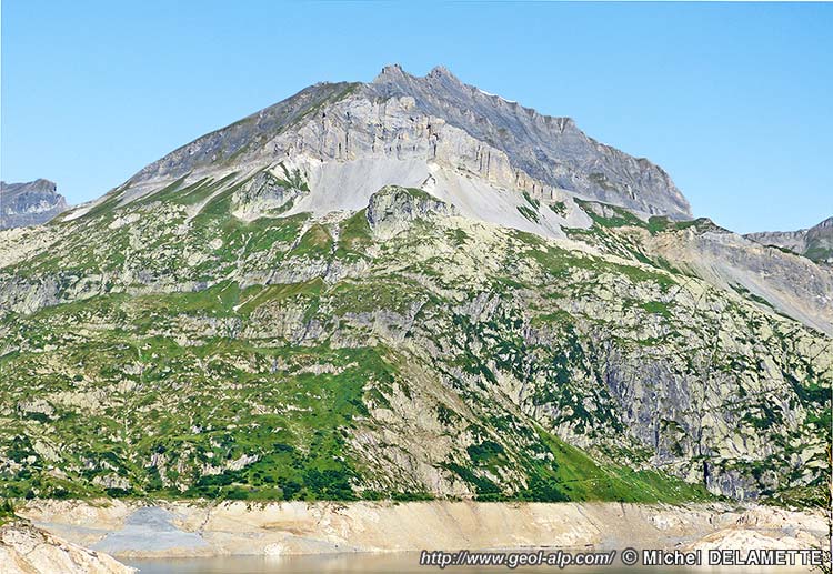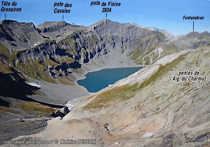 Cette couverture du socle cristallin affleure aussi au nord du lac, où l'on voit (cliché antérieur à celui ci-dessus) qu'elle s'enfonce sous l'éperon rocheux de la crête orientale de la Finive, qui ferme le cirque. Le contact tectonique qui la sépare de la succession subalpine sur-incombante, est incliné parallèlement aux couches de l'un et de l'autre des ces deux ensembles rocheux.