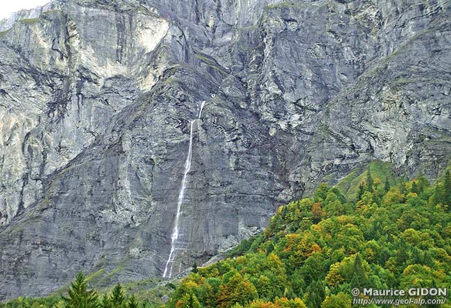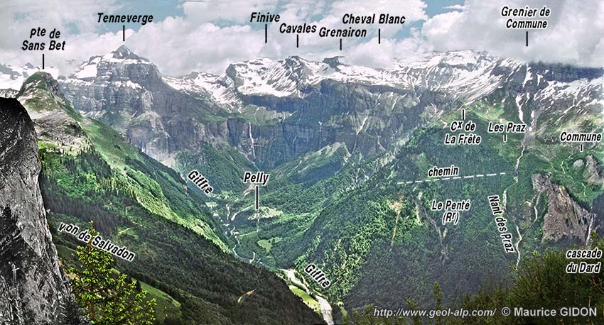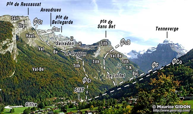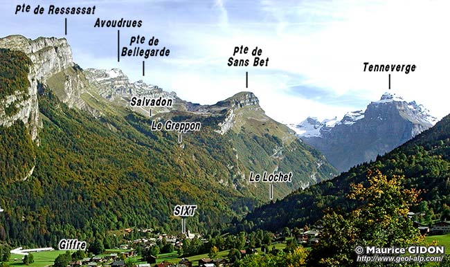 C'est là, plus précisément au Lochet, où le Giffre reçoit les torrents du Salvadon (en rive droite) et des Praz (en rive gauche) que passe d'une rive à l'autre le tracé du chevauchement de Sans Bet. Ce dernier redouble en rive droite la succession au niveau du Jurassique supérieur et du Crétacé inférieur ; il prolonge celui le chevauchement de Finive qui, en rive gauche affecte le Jurassique moyen. Plus en aval, sans doute à peu près à Sixt la vallée du Giffre doit traverser le chevauchement de Commune ; mais dans les basses pentes de rive gauche du Giffre ce dernier redouble les seules couches du Crétacé inférieur et la couverture quaternaire est importante, de sorte qu'il n'est pas aisé de localiser son tracé. Néanmoins on le voit réapparaître en rive droite (au nord) de la vallée, où il se poursuit au sein de couches de plus en plus récentes vers le haut pour constituer le chevauchement des Avoudrues (voir la page "Sixt"). |