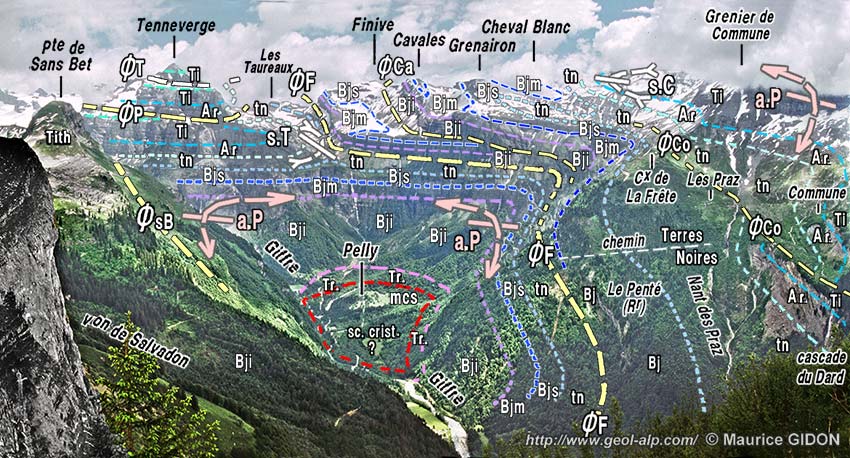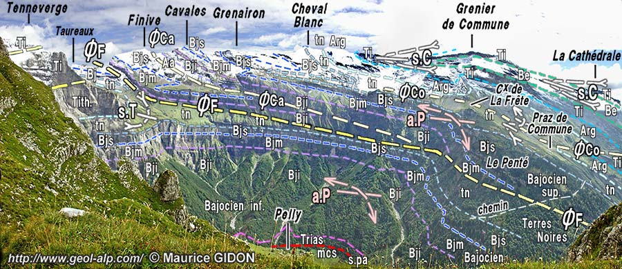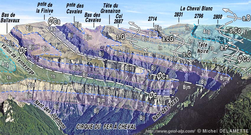 Le versant occidental de la crête Finive - Cheval Blanc, vu du NW depuis la Pointe de Ressassat. (cliché original obligeamment communiqué par M. M. Delamette). Au dessus des abrupts du cirque du Fer à Cheval les pentes plus modérées inclinées vers l'observateur sont en partie des dalles structurales*, conformes au pendage des couches. ØF = chevauchement de la Finive ; ØCa = chevauchement des Cavales ; s.G = synclinal de Grenairon ; a.cG = anticlinal du col de Grenairon ; a.P = anticlinal des Pantets (prolongement du précédent au niveau du Jurassique supérieur) ; s.Co = synclinal des Commune ; a.B = anticlinal du Buet. N.B. 1 : Les axes de plis et les azimuts des surfaces de chevauchement sont presque parallèles à la ligne de crête mais "rentrent" vers la droite (le déversement est en direction de l'observateur). N.B. 2 : à droite des limites du cliché le chevauchement ØCo (= chevauchement de Commune) rompt le couple de plis s.G / a.cG au niveau du Tithonique et a.cG s'y prolonge par l'anticlinal des Pantets (voir la page "Commune"). |