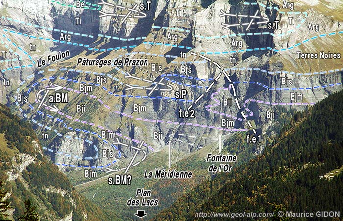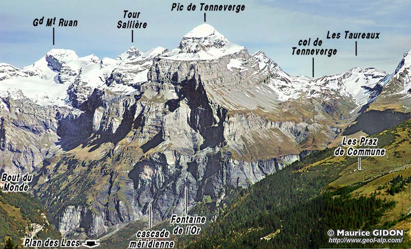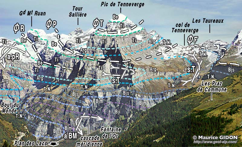 ![]() La montagne du Tenneverge, au nord-est du Fer à Cheval, vu du sud-ouest, depuis le vallon des Foges, à l'est du lac de Gers. Ce cliché montre presque d'enfilade le chaînon du Ruan, qui se termine par le Pic de Tenneverge. Le Plan des Lacs représente le plancher du cirque, qui s'ouvre dans la partie droite du cliché mais est ici masqué par l'épaule boisée d'avant-plan des Praz de Commune. L'empilement de couches et les surfaces de chevauchement subissent la large inflexion générale qui correspond à la grande ondulation synclinale du Criou. Chevauchements : ØT = chevauchement du sommet du Tenneverge ; ØP = chevauchement du Prazon ; ØF = chevauchement de Finive (prolongement probable du précédent) ; ØR = chevauchement du Ruan. Plis couchés majeurs : s.T = synclinal du vallon de Tenneverge (il apparaît comme le crochon* commun aux chevauchements du Prazon et de Finive) ; a.pR = anticlinal du Petit Ruan ; a.BM = anticlinal du Bout du Monde : il est vu à peu près selon son axe, qui, aux abords du Bout du Monde, est presque tangent au versant de rive gauche de la vallée mais qui est orthogonal aux falaises des deux cascades localisées sur cette vue. |