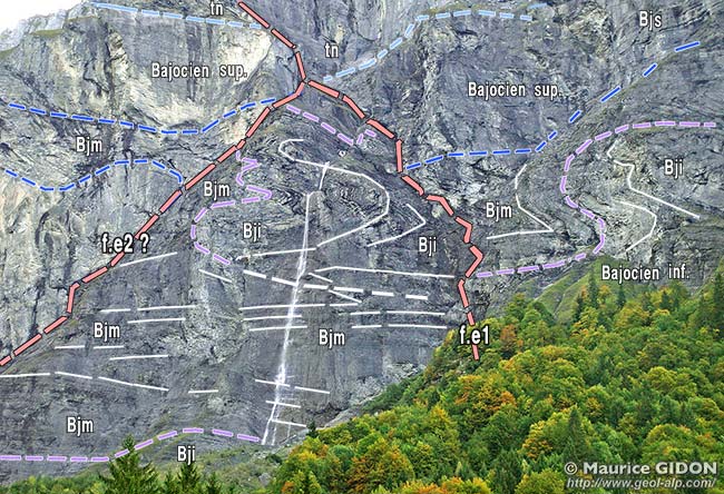 Toutes les couches, d'âge bajocien, affouillées par le cœur du cirque s'enfoncent donc sous les terrains plus récents qui affleurent en rive septentrionale du Giffre et qui s'abaissent vers l'aval de la vallée pour la traverser au niveau du village de Nanbride.