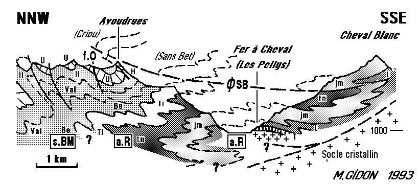 En effet l'interprétation "classique", cherchant à prolonger les dispositions observables plus au nord en Suisse, voudrait que le pied des falaises appartienne au flanc inverse d'un grand pli couché que dessinerait l'anticlinorium du Ruan. Or le dessin des replis qui le constituent montrent que l'on est toujours dans son flanc normal jusqu'au plus bas des affleurements visibles dans le fond du cirque, au Pellys, où affleure le Trias (qui supporte, d'après la carte géologique, les habituels calcaires attribués au Jurassique supérieur). Cette observation est l'une de celles qui justifient le choix d'une interprétation alternative, sans flanc inverse entre les terrains de la nappe et leur soubassement autochtone, laquelle a été adoptée dans la coupe ci-après. |