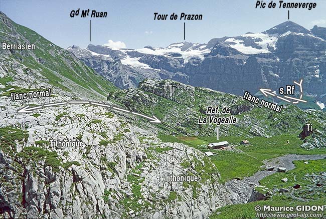 C'est à ce décrochement qu'est dû le fait que le synclinal du Refuge ne se dessine pas dans les bancs tithoniques de rive gauche du torrent. Au contraire les strates, que l'on y distingue assez clairement, dessinent seulement une ondulation anticlinale. Celle-ci affecte le flanc normal du synclinal du Refuge, car la charnière de celui-ci affecte plus au sud le Tithonique dans les raides pentes rocheuses au SE du refuge (voir plus haut le cliché d'ensemble du versant de rive droite de La Vogealle). Elle y est donc décalée d'environ 500 m en sens dextre, par le décrochement de La Vogealle.