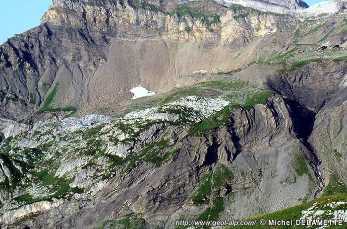 On perd le tracé de ce chevauchement des Bécas dans le versant sud de la Tête de Pérua car il disparaît sous le puissant éboulement tombé à l'aplomb sud de ce sommet. Au delà les deux barres tithoniques de la Tête de Pérua et du refuge de La Vogealle montrent l'une comme l'autre une continuité de leurs bancs respectifs qui permet de trouver, en les suivant, la limite entre la première, chevauchante et la seconde, chevauchée : elle correspond à un alignement d'étroits replats herbeux qui traverse le massif rocheux presque horizontalement. |