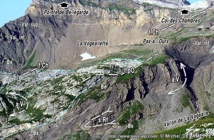 Le long de cette limite du versant, en amont des chalets du Boret jusqu'au refuge de La Vogealle le talweg du torrent de La Vogealle s'élève essentiellement dans les couches du Tithonique : si ces dernières occupent une aussi grande largeur d'affleurements le long de son tracé c'est qu'elles y décrivent un enchaînement de deux plis déversés vers le NW, l'anticlinal de La Vogealle et le synclinal du Refuge de La Vogealle.