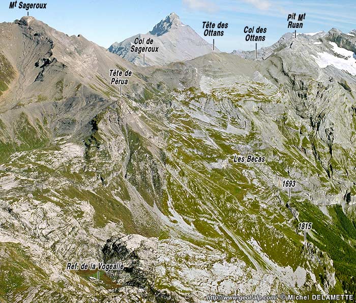 Au dessus du cul de sac du Bout du Monde les pentes de la rive droite du vallon des sources du Giffre s'élèvent par une succession de ressauts jusqu'à culminer au Mont Sageroux. Au nord-est du torrent de La Vogealle et du refuge de ce nom (voir la page "Vogealle") les pentes sud-orientales de ce sommet s'étendent jusqu'à la crête frontière franco-suisse, au col des Ottans. Elles sont modérées bien que coupées de ressauts, tandis qu'au delà de ce col la suite vers l'est de cette crête, qui mène au Mont Ruan, est beaucoup plus rocheuse (voir la page "Ruan"). Ce changement tient à ce que l'ensemble du versant est principalement constitué par les calcaires du Tithonique mais que, à l'ouest du col des Ottans, sa partie haute est couronnée par un talus de couches principalement marneuses du Crétacé inférieur.