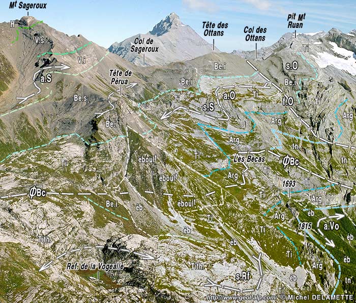 En contrebas du talus berriasien qui court depuis la Tête de Pérua jusqu'au col des Ottans les pentes du versant français, inclinées vers le sud-est sont presque totalement sculptées dans les couches du Tithonique. Ces dernières y doivent la grande surface qu'elles occupent à ce sont affectées par plusiers accidents tectoniques. En premier, lieu il s'agit du couple de plis déjetés vers le NW formé par le synclinal de Sageroux et l'anticlinal des Ottans ; le plan axial de ce dernier, orienté NE-SW, est disposé de façon à passer vers le SW en tangence au dessus des pentes plus occidentales du Mont Sageroux, de sorte que ce pli ne se prolonge pas vers le SW dans ce versant.