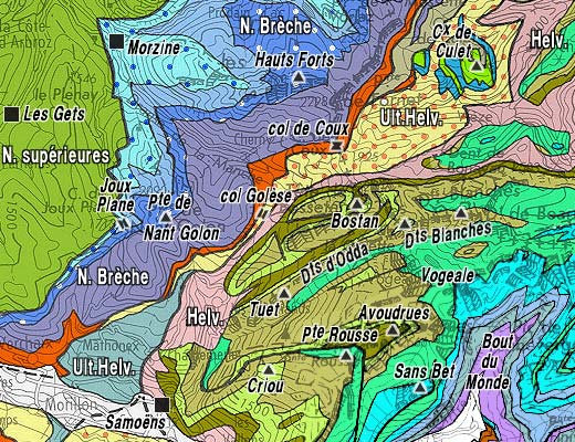Par rapport à la coupe naturelle de la nappe de Morcles (voir la page "Dents du Midi") le prolongement oriental de l'anticlinal de Bostan se situerait plus au nord que le pli le plus septentrional de l'anticlinorium couché, qui est l'anticlinal de Rossétan (cf. cliché plus haut dans la présente page). Depuis ce pli le long flanc renversé qui chevauche le flysch du Val d'Illiez se poursuit bien vers l'ouest jusqu'à se raccorder au flanc nord de l'anticlinal de Bostan. Mais rien ne prouve que, sur cette transversale plus occidentale, il se poursuive vers le sud par un long flanc inverse qui se prolongerait sous le massif de Sixt jusqu'aux abords du Buet (comme le voudrait l'interprétation d'un prolongement en France de la structure en anticlinorium couché : voir la page "nappe de Morcles") : ceci est d'autant moins plausible que l'on voit réapparaître peu en contrebas nord la même succession perçant le flysch à la faveur de l'anticlinal de Barme, puis de celui de Champéry. En fait la coordination des plis du Haut Giffre avec ceux du massif des Bornes montre que l'anticlinal du Tuet se prolonge très vraisemblablement par l'anticlinal du Bargy, le synclinal de Bostan par le synclinal de Cenise et l'anticlinal de Bostan par celui des Frêtes-Leschaux. Mais là aussi ce train de plis ne se termine pas par un renversement vers le nord qui puisse se poursuivre par un long flanc inverse étiré, comme l'implique l'hypothèse d'un prolongement "cylindrique" de la nappe de Morcles. Au contraire il se poursuit plus au NW, par enchaînement synclinal, avec les anticlinaux plus occidentaux du Parmelan et d'Andey (lesquels sont donc dans une situation comparable à celle de l'anticlinal de Barme dans le Val d'Illiez). |