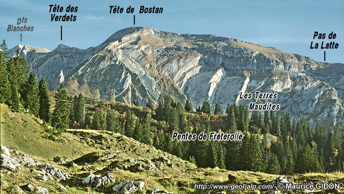 La Tête de Bostan est le point culminant d'une longue croupe qui s'élève d'ouest en est en dominant le vallon le plus méridional des sources de la Dranse. Ce petit chaînon peut presque être considéré comme un mont* jurassien car son relief est de type conforme, se moulant sur la voûte de l'anticlinal de Bostan : celle-ci a été décapée de son enveloppe de flysch nummulitique marneux par l'érosion, qui a mis à nu de la carapace de calcaires, nummulitiques à urgoniens, qui l'arment. Au sud-ouest du sommet son flanc nord a en outre été éventré de plus en plus profondément d'ouest en est, par ablation de tranches successives (de plus en plus anciennes dans la succession stratigraphique), chacune dénudant en pelure d'oignon l'une des spectaculaires dalles convexes des Terres Maudites, qui plongent à tour de rôle vers le nord-ouest.