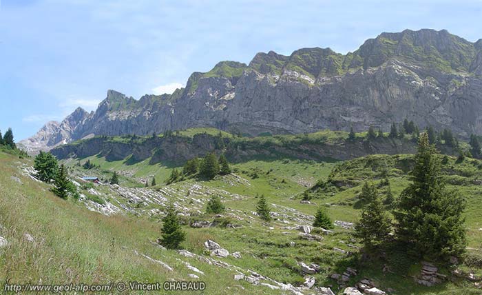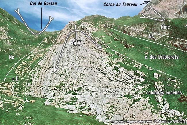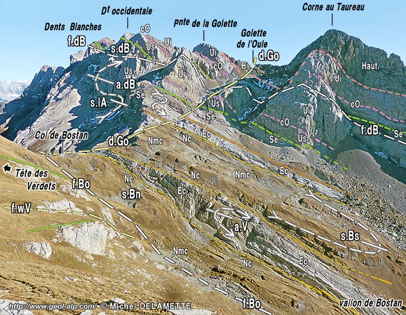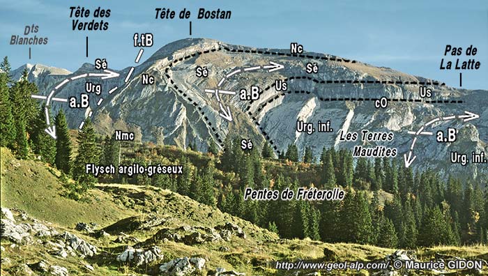 Au sud-est du col de Bostan cette disposition porte les calcaires urgoniens du flanc sud de ce synclinal, légèrement renversé, à former la crête sommitale des Dents Blanches (ils y sont d'ailleurs redoublés par la faille des Dents Blanches : voir la page "Dents Blanches").