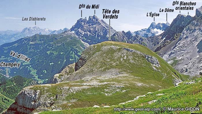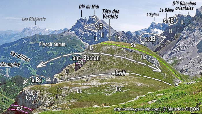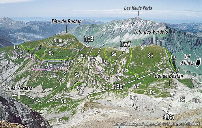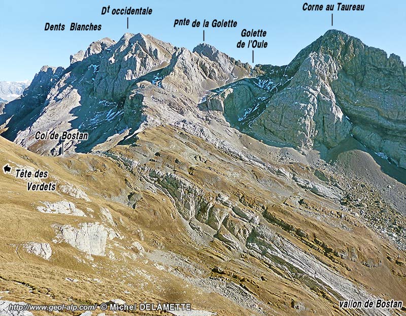 Le relief conforme, arrondi, de la voûte de cet anticlinal de Bostan se poursuit parfaitement, jusqu'à la Tête des Verdets incluse, au prix de quelques accidents de terrain dus à des cassures transversales apparemment sub-verticales. Par contre à l'est de ce dernier sommet la crête s'effondre car l'érosion a complètement supprimé le matériel constitutif du pli, à l'exception de son flanc nord qui affleure en pied de falaise au dessus des pentes de flysch nummulitique, qu'il tend à recouvrir en se déversant vers le nord.