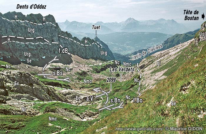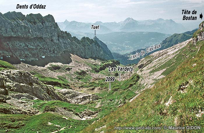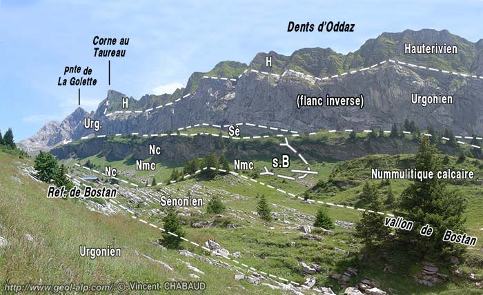Du côté sud-ouest (vers l'aval du vallon) au contraire le synclinal de Bostan s'épanouit au pied de la crête Dents d'Oddaz - Pointe du Tuet , laquelle correspond au flanc sud, un peu renversé, du synclinal.