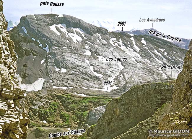 On peut enfin s'étonner du caractère très large et très ouvert du synclinal de La Combe aux Puaires, qui détonne dans le contexte tectonique de ce secteur : son style contraste avec celui de ses deux plis bordiers, savoir, au nord l'anticlinal très fermé du Tuet (qui est même écrasé transversalement du côté oriental : voir la page "Dents Blanches") et, du côté méridional le puissant anticlinal, rompu en chevauchement, de la montagne du Criou et des Avoudrues. |