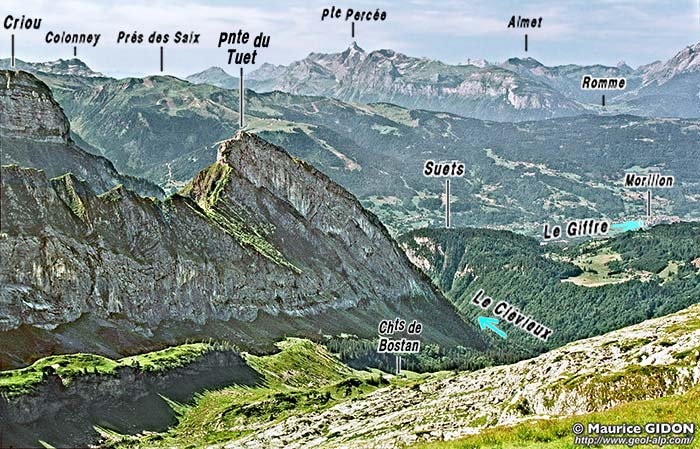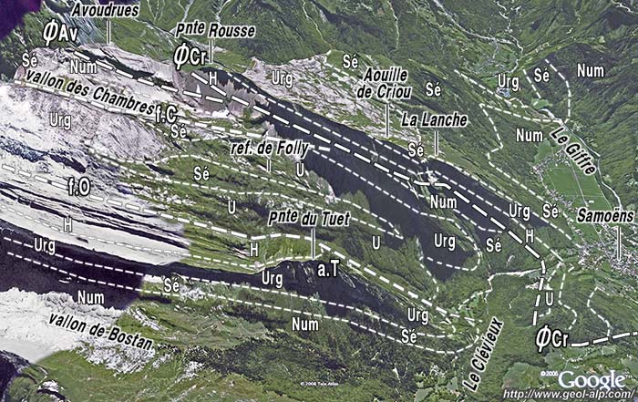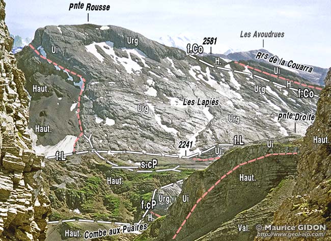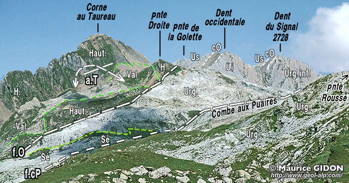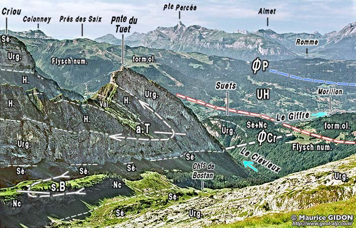 ![]() Le versant nord de la Pointe du Tuet et le vallon de Bostan vus du nord-est, depuis l'échine de Bostan (en arrière-plan le chaînon des Aravis) La charnière anticlinale du Tuet (a.T) n'est pas vue exactement selon son axe et elle est coupée en biseau aigu par les falaises, de sorte que sa forme est un peu caricaturée (elle est en fait plus arrondie). s.B = synclinal de Bostan ; ØCr = terminaison nord-occidentale du chevauchement du Criou. Ce chevauchement s'amortit dans le flysch nummulitique et, vers la gauche, passe derrière la crête du Tuet, en contrebas du sommet de l'Aouille de Criou ; UH = ensemble anciennement attribué à l'ultrahelvétique inférieur, constitué par la formation olistolitique (form.ol.) de la fin des dépôts nummulitiques. |