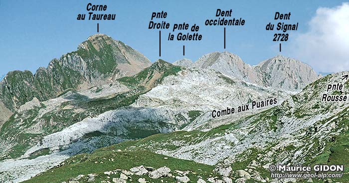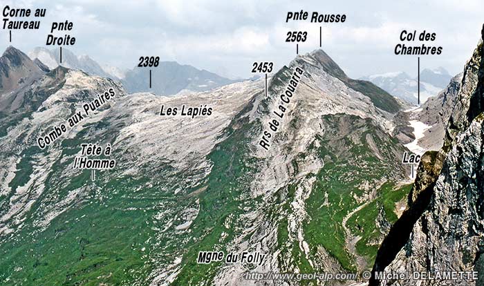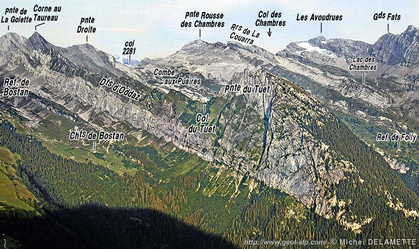 Le versant montagneux incliné vers le SW d'Oddaz et des Chambres se termine du côté oriental par une crête très dissymétrique qui court depuis la Corne au Taureau jusqu'au col des Chambres en passant par la Pointe Rousse. En fait il s'agit du sommet de l'abrupt qui limite le cirque du Lac de La Vogealle du côté ouest (voir la page "Vogealle"). L'orientation presque N-S, orthogonale aux structures, et l'importance de cet abrupt, qui se prolonge presque jusqu'au lit du Giffre sont deux caractères tout-à-fait étranges par rapport à la dispostion générale du relief du massif. Il est tentant d'envisager qu'ils aient été induits par le jeu la faille de décrochement de la Vogealle (dont le tracé traverserait la crête des Dents Blanches à La Golette de l'Oule (400 m à l'est de la Corne au Taureau).